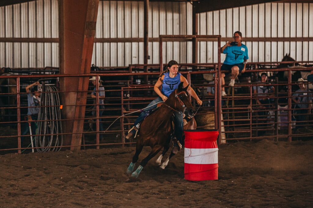 Girls and their horses practice the clover-leaf pattern as they are speeding around the barrels.
