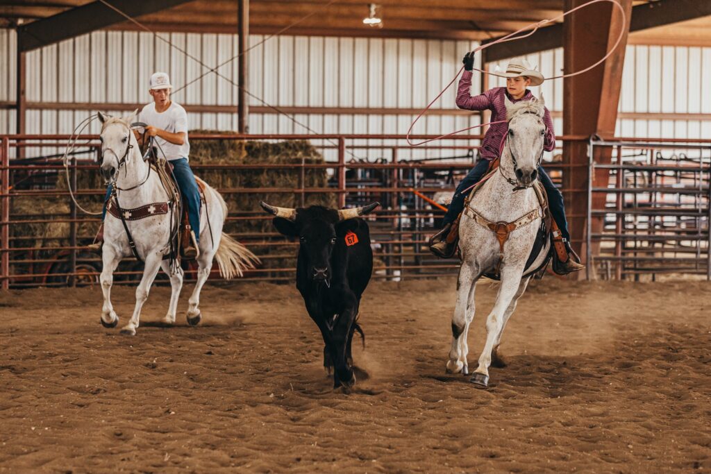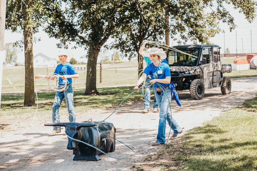 Participants learn teamwork as they partner with other campers to head and heel a steer by roping the head and back feet as it bursts from the chute