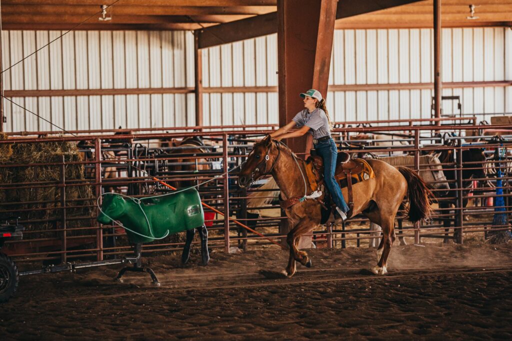 Participants and their horses practice tracking and roping the calf as it bursts from the chute